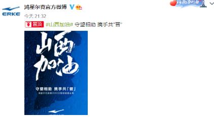 10月10日晚间,鸿星尔克通过官微宣布捐赠2000万物资驰援山西,并祝福山西加油,守望相助 携手共“晋”。