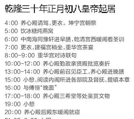 在吴士洲先生的《乾隆一日》中,我们看到了清朝最有福气的皇帝乾隆一天生活,这一天是指乾隆三十年正月初八日(1765年1月28日),具体内容见上图。