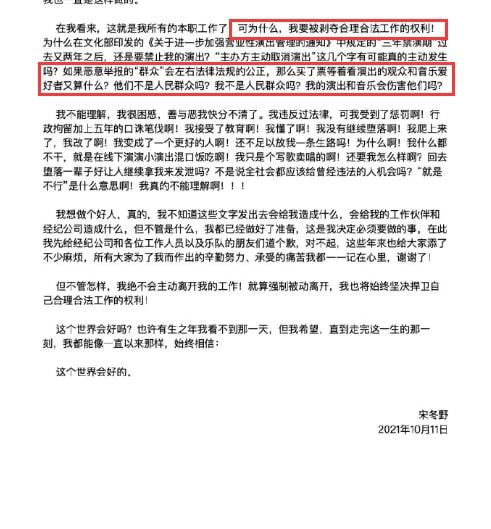 面对自己的演出被取消,宋冬野发了一则长文来诉说自己内心的不快。可以说,这篇长文是宋冬野内心真实的写照。人们从这篇长文中看到了一个曾经吸毒者5年后的真实内心,他毫无悔改之意。既然是自己的演唱会被取消,宋冬野内心是不忿的。首先,他认为自己的演唱会已经经过了层层审批,到最后却因为个别“群众”的举报而被取消,这不公平。他始终认为这是个别人恶意举报的结果。