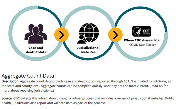 “疫情汇总数据”来自60个“美属管辖地”(U.S.-affiliated jurisdictions)的报告。CDC的统计系统则会将各管辖地的数据汇总发布在CDC的“疫情数据追踪系统”(COVID Data Tracker)上。