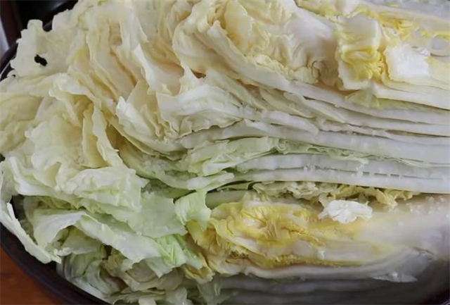 1.准备一个大白菜,先把白菜后面的根切掉,然后在白菜的根部切一刀,用手把白菜撕开,再从根部切一刀用手撕开,把一个白菜分成四等份,接下来把白菜放盆里,每一层白菜上面都撒上盐,这样做主要是为了杀出白菜里面的水分,盐不用担心放多了,因为腌好后还要再洗一遍,现在把白菜这样放置腌一天。