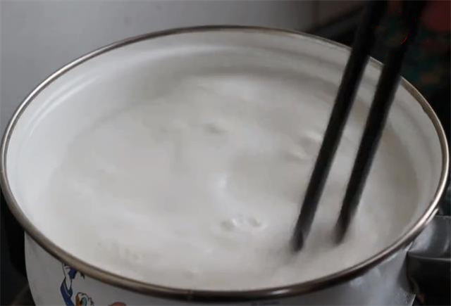 3.盆里倒入700g的水,里面加入80g的糯米粉搅拌均匀,搅匀后把糯米糊倒入一个小锅里面,开小火烧开,边加热、边用筷子搅拌防止粘锅,把糯米糊烧开后关火晾凉备用。
