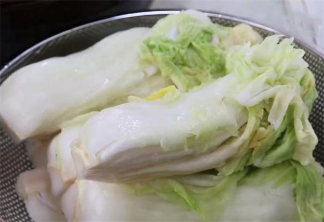 2.今天是第二天,满满一盆白菜已经杀出了很多水分,现在把这些白菜拧干水份,用清水多清洗两遍,把白菜里面多余的盐分都洗掉,然后拧干白菜上面的水分,把白菜放篮子里控水备用。