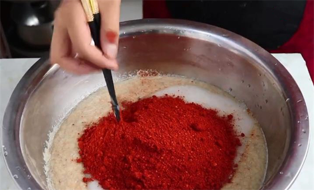 5.然后倒进榨汁机里面,加入200ml的鱼露,把它们榨成糊,榨好后倒入盆里,里面再加入晾凉的糯米糊,加入大约50g的白糖,250g的辣椒面搅拌均匀。