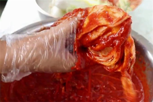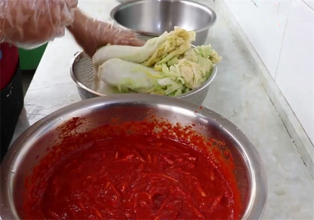 7.接下来把控干水分的白菜放盆里蘸上这个辣酱,每一层都均匀地裹上辣酱。