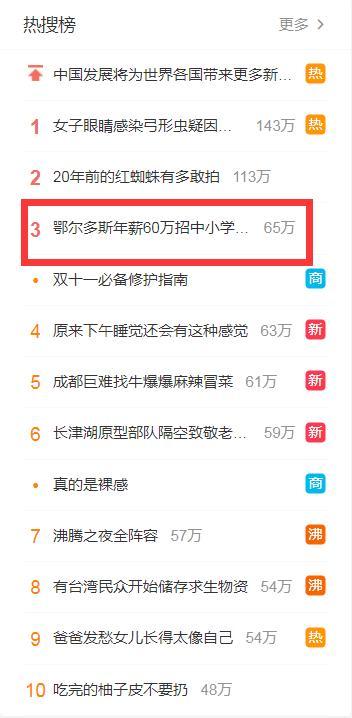据中国新闻周刊报道,近日,地处西部内陆的城市鄂尔多斯,打出了年薪60万招聘清华、北大毕业生当中小学教师的招聘启事,该新闻还一度上榜冲上微博热搜!
