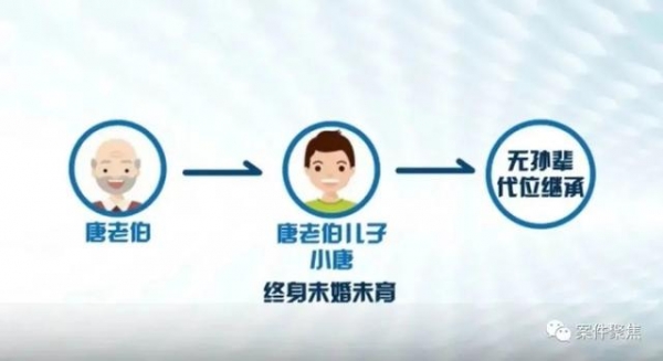 不过,《继承法》中,还规定了可以代位继承的情形:被继承人的子女先于被继承人死亡的,由被继承人的子女的晚辈直系血亲代位继承。也就是说,唐老伯的孙辈可以代替唐老伯的儿子来继承遗产。但唐老伯的儿子小唐终身未婚未育,没有孙辈能够进行代位继承。