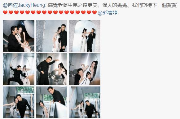 据悉,之前郭碧婷和向佐就曾公开说过会要二胎,向佐发文称老婆生完孩子之后变得更美了,他们也很期待有下一个宝宝。