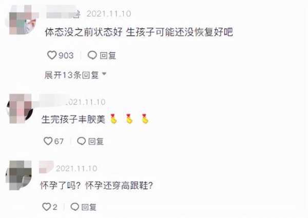 网友们纷纷留言猜测郭碧婷是不是又怀孕了?但也有人表示她可能只是因为产后身材变丰腴了一点而已。