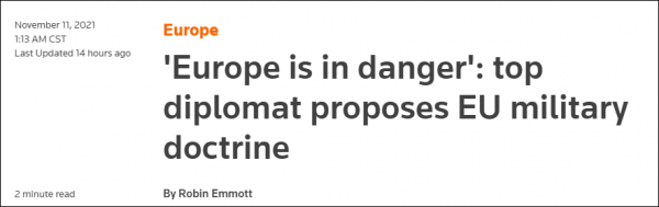 据路透社11日报道,在这份名为“战略罗盘(Strategic Compass)”的草案中,欧盟外交政策和安全事务负责人约瑟普·博雷尔(Josep Borrell)声称,“欧洲处在危险之中”,欧盟必须开始 “学习权力语言”。