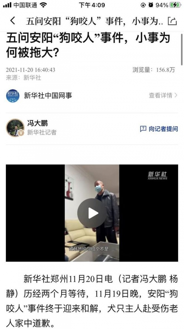 11月19日晚,河南安阳“狗咬人”事件中犬只主人王新刚向被咬伤老人及家属道歉。历时两个月,这起普通的民事纠纷最终在发酵成为全网舆论焦点后迎来和解。