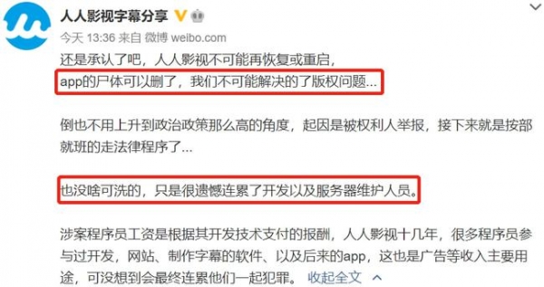 在一审判决对外公布后,“人人影视字幕组”官方微博也发文明确了“人人影视不可能再恢复或重启”,并表示,“App的尸体可以删了,我们不可能解决得了版权问题……”。