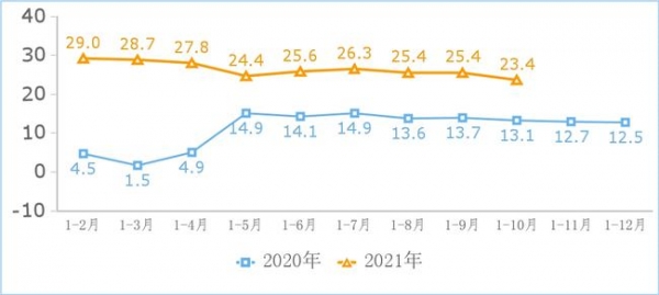 1—10 月份,互联网企业实现营业利润 1174 亿元,同比增长 21.3%,增速较前三季度提高 4.5 个百分点,两年平均增速 14.9%。营业成本同比增长 20.9%,增速较前三季度下降 3.7 个百分点。