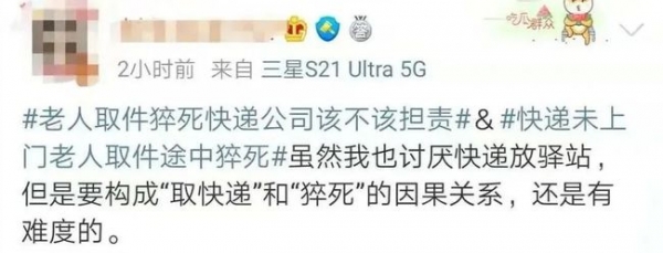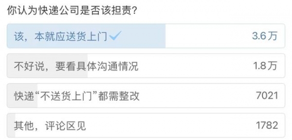 而在微博关于#老人取件猝死快递公司该不该担责#的投票中,截至发稿,超3.6万的网民认为应该。