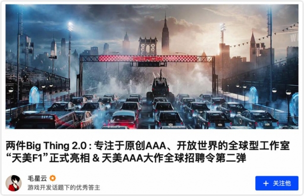 前不久,天美郑重宣布成立 F1 工作室,启动了全新的“ Future ”序列,天美的满腔雄心可见一斑。毛星云在知乎发布了“天美 AAA 大作全球招聘令”,并透露有多款 3A 级原创 IP 项目在研,包括射击、动作等热门玩法,融合驾驶、探索等元素。