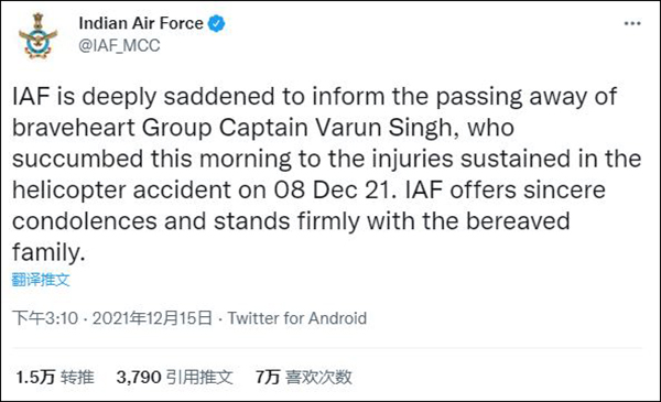 12月15日,印度空军(IAF)在社交媒体发布消息称,在8日印度空军直升机坠毁事故中唯一幸存者、机长瓦伦·辛格(Varun Singh)已于当天上午不治身亡。