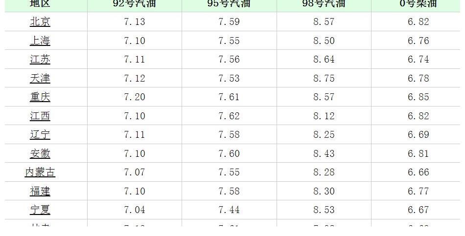 今日油价:附表是经过最新油价调整后的今日全国油价信息。