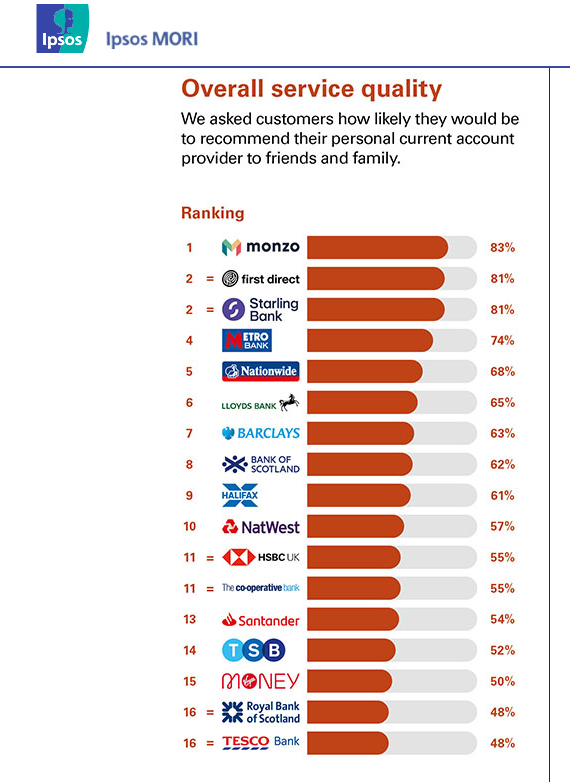英国新闻界主要行业监管机构独立新闻标准组织(IPSO)去年8月的一份报告显示,从整体服务满意度排名来看,挑战者银行的总体满意度水平要高于传统银行。在该报告中,Monzo(第1)和Starling Bank(第2)的排名,远高于巴克莱(第7)和汇丰(第11)等传统银行。