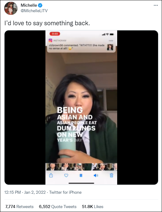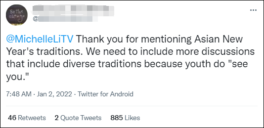 一位推特用户感谢李提到了亚洲新年的传统,并写道:“我们需要纳入更多包含不同传统的讨论,因为年轻人确实会‘看到你’。”