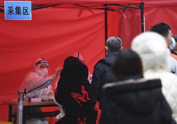 1月7日,在郑州市金水区花园路街道办事处省银行社区核酸检测点,医务人员为市民进行核酸检测取样。新华社图。