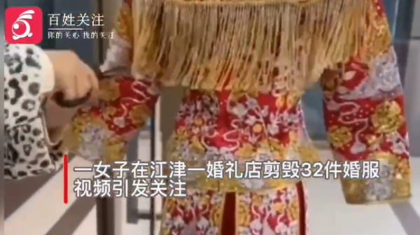 1月14日,重庆一女子在江津区一家婚礼店剪毁32件婚纱的视频引发关注。14日,婚礼店负责人陈女士称,这是一场误会,之前和新郎已经谈妥了,将定金作为宝宝出生后宴会的布置费用,后面她又想要来退,从而引发了剪婚服时间的一幕。