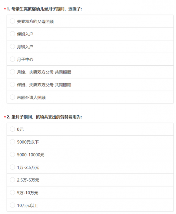 此外,问题还包括“2021年,夫妻双方接受其他来源的经济支持(如来自婴幼儿祖辈的支持)金额”、2021年平均每月为婴幼儿购买食物、营养补充剂、生活用品、家用设施的花费,并设置了母亲生完孩子做月子期间的照护选择、婴幼儿父母祖辈等人平均每天照护时间等问题。