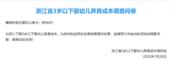 公开资料显示,为深入了解3岁以下婴幼儿养育成本,为下一步制定相关生育政策提供科学支撑,根据浙江省发改委要求,浙江省卫生健康委妇幼处制作了《浙江省3岁以下婴幼儿养育成本调查问卷》,发放“问卷星链接”开展调查。调查对象是浙江省内3岁以下婴幼儿的父母,截止日期为2月8日。