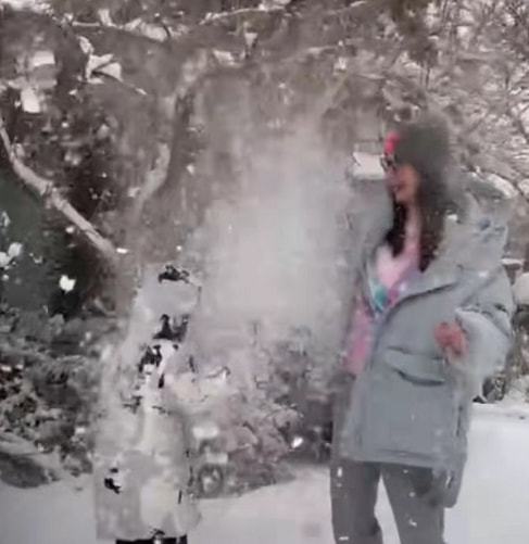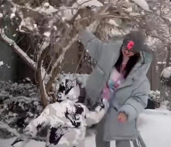 经纬的儿子身穿白色羽绒服,小家伙已经长到妈妈腰部了,在雪地里跑来跑去非常活泼。母子俩在雪地里玩儿得不亦乐乎,画面相当温馨。