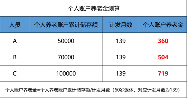 2.个人账户养老金=个人养老账户累计储存额/计发月数(60岁退休,对应计发月数为139)