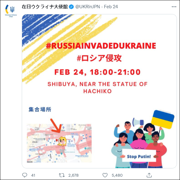 梳理其24日的推文,乌克兰驻日本大使馆先是称俄罗斯对乌“战争开始了”,然后笼统地请求国际社会给予乌克兰支援,并表示当晚会在日本东京都组织“阻止普京(Stop Putin)”的游行活动。