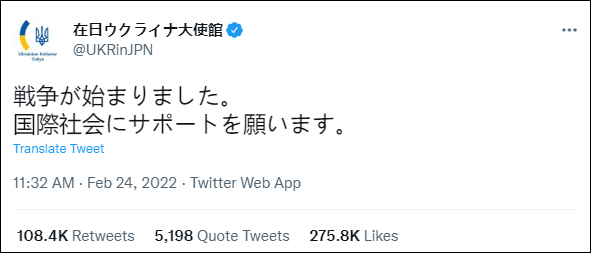 随着俄乌局势不断升级,25日上午,乌克兰总统泽连斯基发表讲话,抱怨没有任何国家向乌克兰作出派兵保证,乌克兰只能独自战斗。值此之际,乌克兰驻日本大使馆的推特账号开始在24、25日连发多条推文,“求支援”。