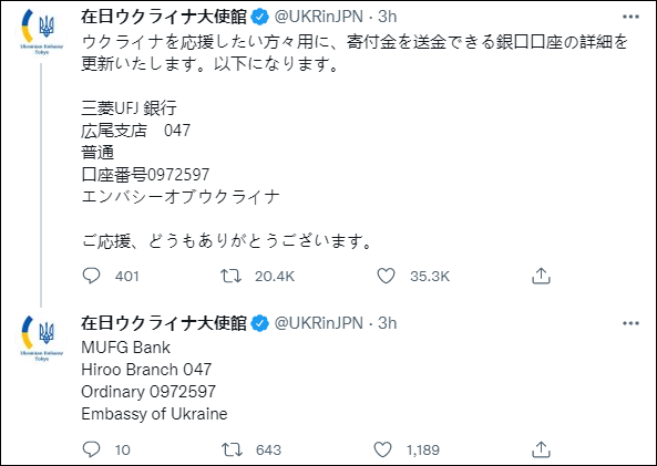 自此,乌克兰驻日本大使馆开始连发推特,恳请网民众筹支援乌克兰,并公布了多个筹款银行账户。结果确实有不少日本网民纷纷表示会捐款,许多人还上传了汇款截图与照片。
