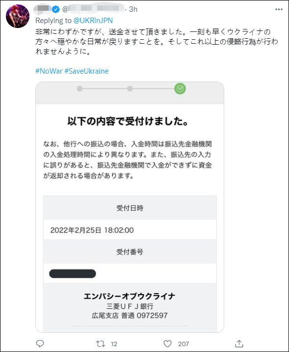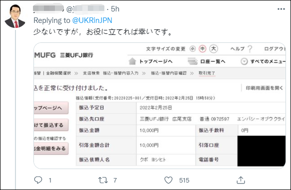“虽然金额不多但还是要汇款,我支持乌克兰。”