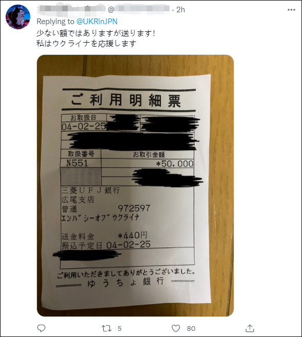 “虽然非常少,但我还是汇了钱。希望乌克兰人民早日恢复平静的日常生活。不要再让更多的‘侵略’行为发生。”