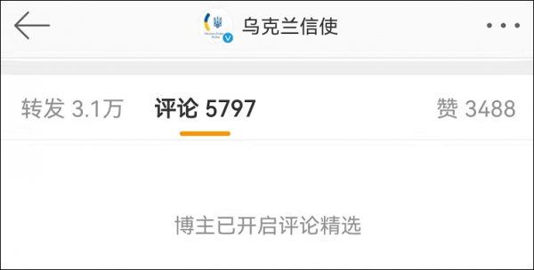 截至25日晚21:00,这条微博的评论数超5700条,不过@乌克兰信使 已开启评论精选,目前没有网友留言露出。
