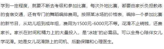 有家长算过一笔账,每节一对多的私教课价格为330元,一个课时仅30分钟,一般孩子每天上冰时间为一个半小时,一天下来光课时费就近千元。平时孩子一周来四次,寒暑假每天都会来训练,一周下来就是四五千元的支出。这还不包括孩子的陆地课、舞蹈课费用。阿克塞尔两周半跳跃,这种跳跃在业内的别称是“百万跳”,指的是从起步到完成两周半,至少要耗费一百万元。