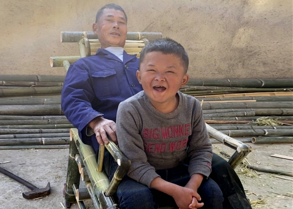 范小勤和父亲范家发坐在竹椅上休息。黄新龙摄