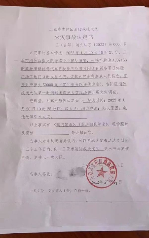 根据三亚市消防部门出具的《火灾事故认定书》显示,起火原因"电池故障引发火灾"。威马方面坚称车辆不存在问题,起火原因系碰撞导致。但该事故车起火前并未发生碰撞。