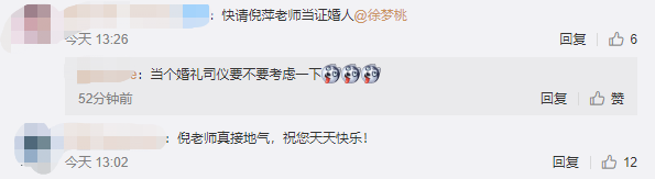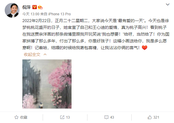 得知喜讯的倪萍发文为徐梦桃送上自己的祝福。倪萍表示:"今天也是徐梦桃桃花盛开的日子,她官宣了自己和王心迪的爱情,真为桃子高兴!"