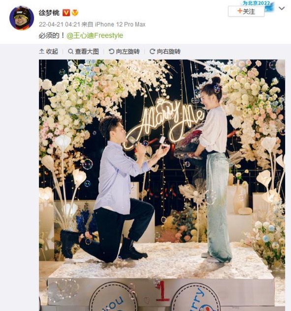 4月21日凌晨,王心迪在社交平台晒照并配文"桃墩墩,你可以嫁给我吗?"正式向徐梦桃求婚。随后徐梦桃便相继转发回应"必须的。"照片中,王心迪在领奖台上单膝跪地递上戒指,徐梦桃手捧玫瑰一脸幸福。