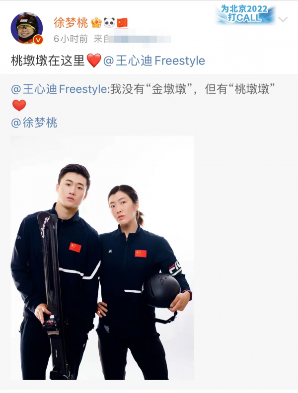 男友王心迪在个人社交平台写到:"我没有金墩墩,但有桃墩墩。"他还贴心地配上了一个小爱心,配上两人的合照。徐梦桃紧跟着转发了这个表白动态并说道:"桃墩墩在这里。"