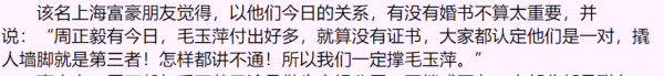 这番话无异于火上浇油,圈内的富商好友纷纷为毛玉萍打抱不平,"这么多年,毛玉萍和周正毅虽然没有领证,但大家早已默认他们是一对。撬人墙角就是第三者!"