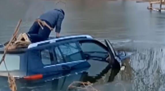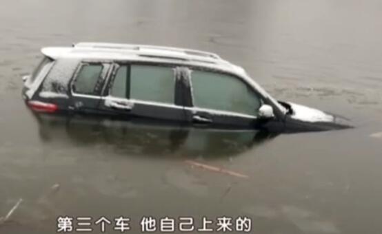 而第二次冲入塘里的是一辆宝马760,事发时还是下午,光照条件也不错。贾先生听到有人呼救,出门一看又一辆车扎入了自己的鱼塘中央。现在那位司机正从车顶的天窗里往外爬,最终是贾先生用绳子把人救了上来。只有第三辆奔驰车因为是冬季,又是一辆SUV,所以司机自己直接爬上了岸。