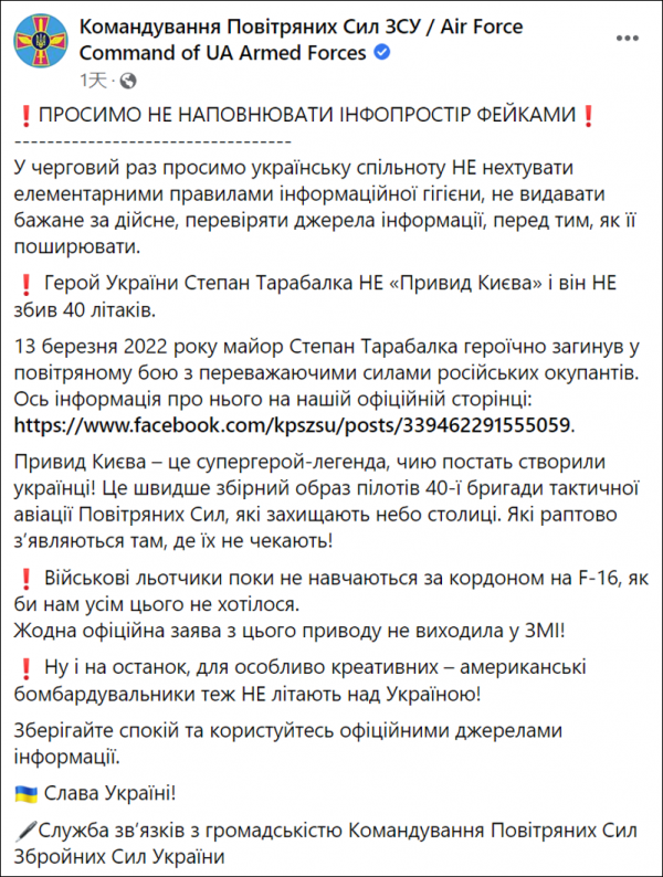 乌克兰空军司令部官方脸书账号发布的贴子 社交媒体截图