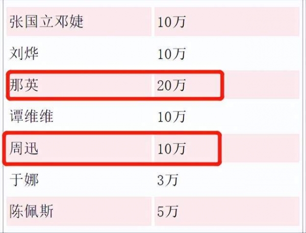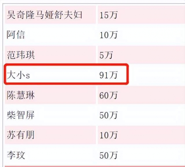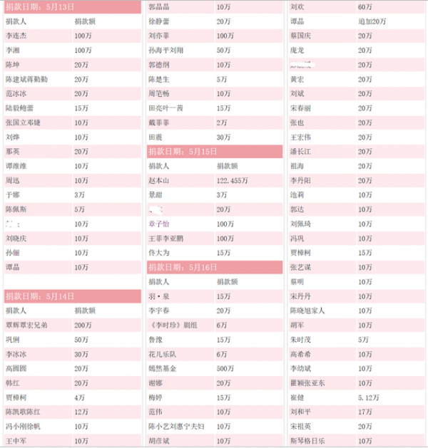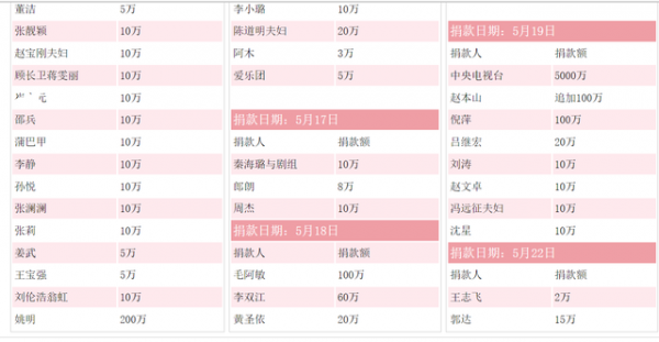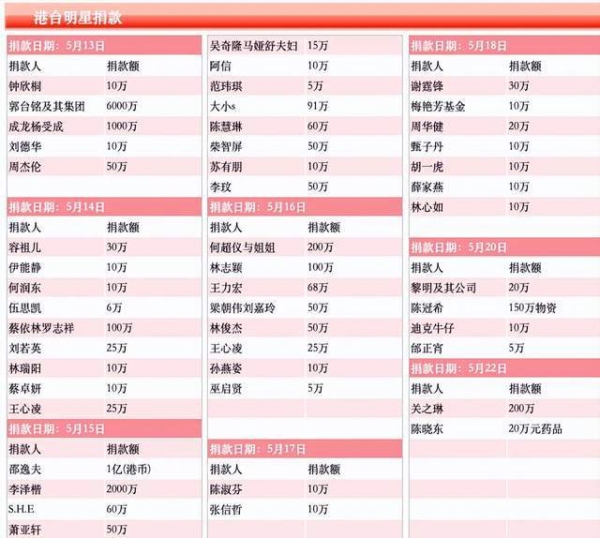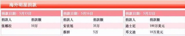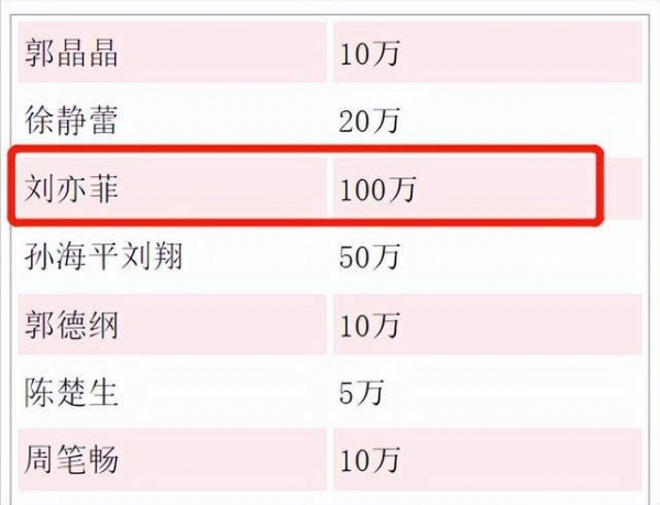当年走红后的刘亦菲捐出了100万,还是当红主持人的李湘捐出100万,还没有二度翻红的孙俪也捐出了10万,港台明星部分,大小S捐出91万,SHE60万,林志颖100万,关之琳也是100万。