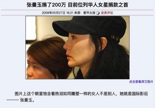 在诸多捐款的女明星中,张曼玉捐款的数额是最高的,而且张曼玉没有与别人一同捐款,也没有通过捐赠物资累计金额,而是直接捐了200万,在当时是捐款华人女明星之首。除此之外,张曼玉后续通过慈善义卖捐了42万,全部都是以个人名义。
