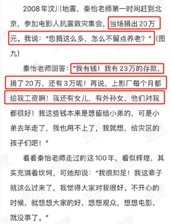 "2008年汶川地震,秦怡老师第一时间赶到北京,参加电影人抗震救灾集会,当场捐出20万元。我说:'您捐这么多,怎么不留点养老?'秦怡老师回答:'我有钱!我有23万的存款,捐了20万,还有3万呢!再说,上影厂每个月都给我工资啊!我还有女儿,有外孙女,他们对我都很好!我这些钱本来是想留给小弟的,可是小弟去年走了,我也用不上了,我就想,给灾区的孩子们吧!'"