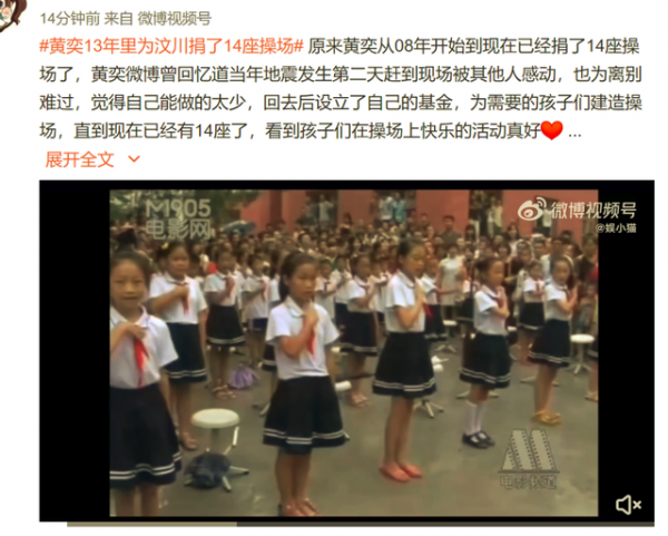 黄奕从2008年汶川地震之后,就一直为汶川捐赠操场。回忆当年汶川地震发生后,黄奕赶到现场情绪复杂,遗憾自己能做得太少,于是回去之后建立了自己的基金会,为汶川的孩子们建造操场,如今黄奕已经为汶川捐了14座操场,这种持续的牵挂与默默的付出,让人很是感动。