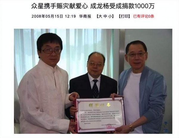 大哥成龙为了灾区也是忙前忙后,并且还与英皇集团主席杨受成合力捐款1000万,这笔数额在当时算得上最多的善款。