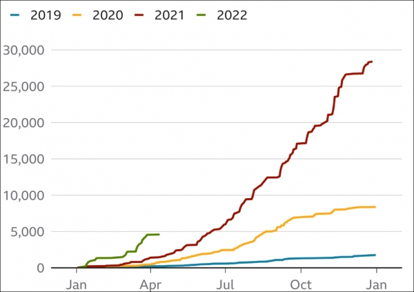 2019-2022年,穿越英吉利海峡偷渡赴英人数逐年增加 图自BBC